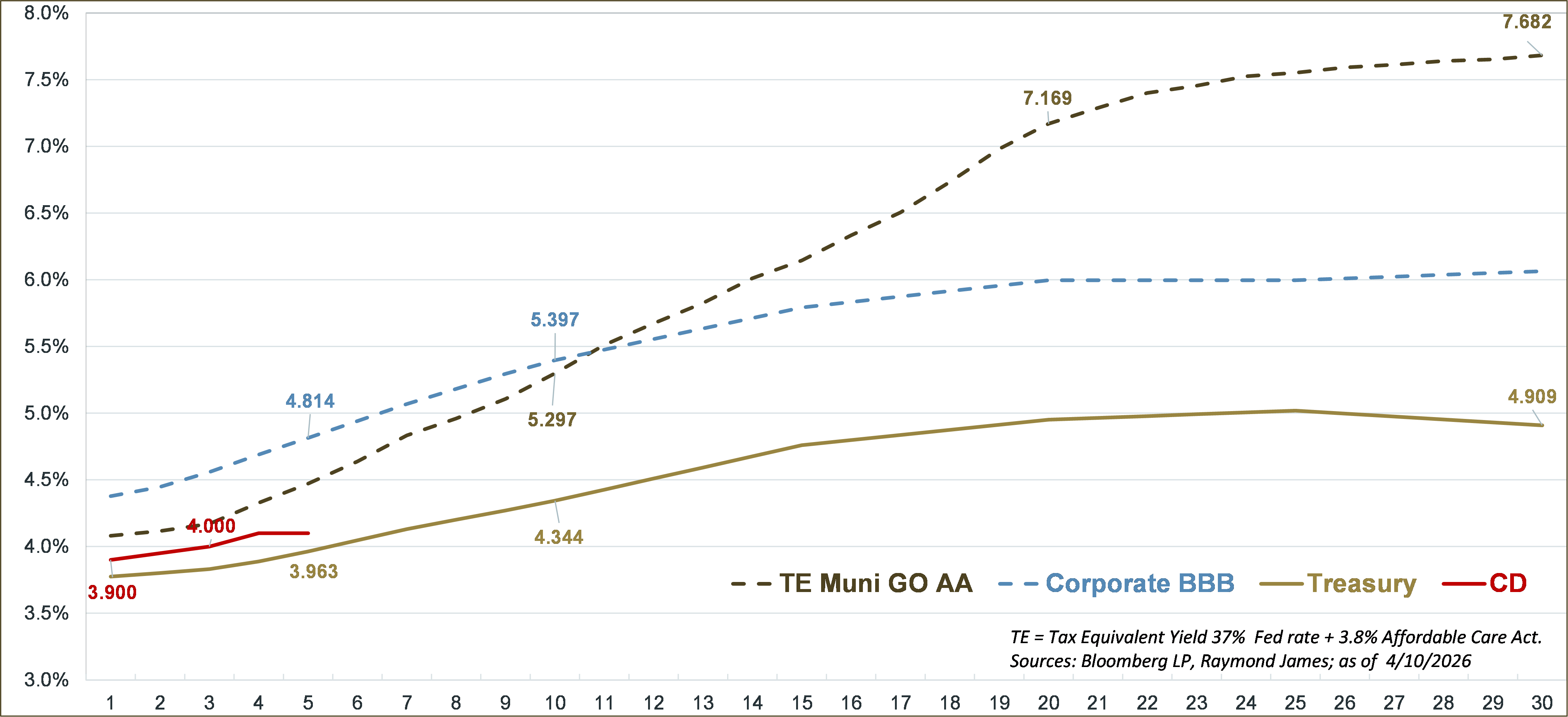 Since yield curves often reflect investors' expectations for future rates, they can be both informative and sometimes misleading. More often, they are insightful. In addition, the relative historical level of interest rates is as important as the current relationship between maturities. Note the two Treasury curves above – one being the April 10, 2026, and the other from January 2022. Both are upward-sloping, providing higher rates for longer maturities. However, the current interest rate environment is relatively elevated compared with January 2022. Every maturity today gives an investor a much higher return. When in a historically high-interest-rate environment, it can be advantageous for an investor to lock in for as long as their risk profile and overall goals permit.